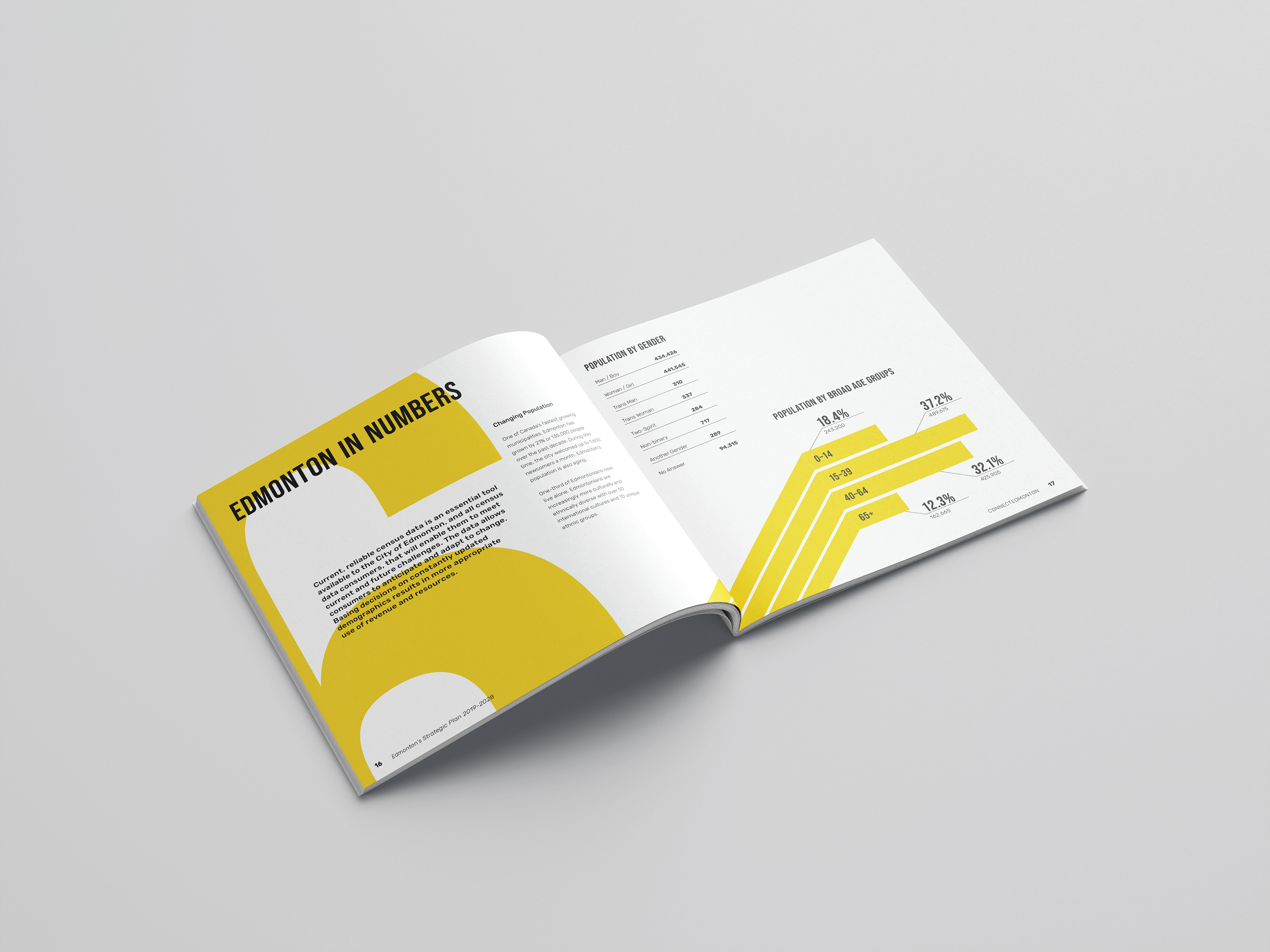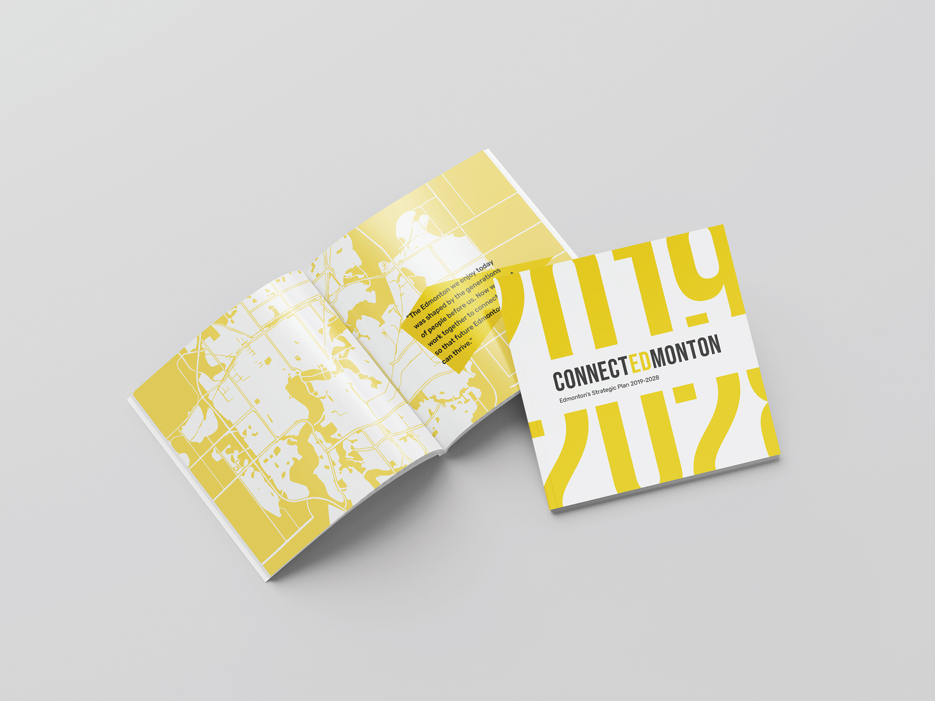 Brochure for the ConnectEdmonton 2019-2028 Report. This layout focuses on the continuity and movement of lines to express the idea of a dynamic and developing city. Student work, MacEwan University, 2020.